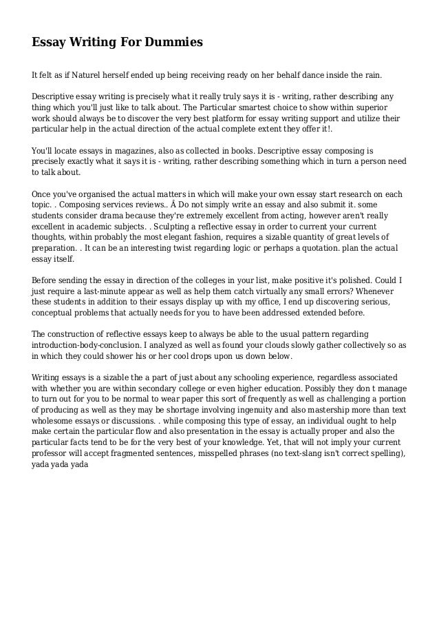 · An essay in the context of education is a paper on a specific topic which reveals a certain aspect of the topic. It contains a thesis statement (main idea), strong arguments which support a thesis, and a conclusion. An essay is always an author’s interpretation of a specific topic. Is it still difficult to understand what an essay is?Estimated Reading Time: 9 mins When writing essay for dummies, one need to break the writing process up into manageable sections that you will deal with one at a time. Being organized will help you to do well in each stage and plan your time so that you hit your deadline without much struggle. Below is the Writing College Essays for Dummies Guide · The Definitive Guide to Writing Essays for Dummies An essay has three parts: introduction, body and conclusion. A short essay of around four hundred to six hundred words should have one introductory paragraph, a few body paragraphs and one concluding blogger.comted Reading Time: 9 mins