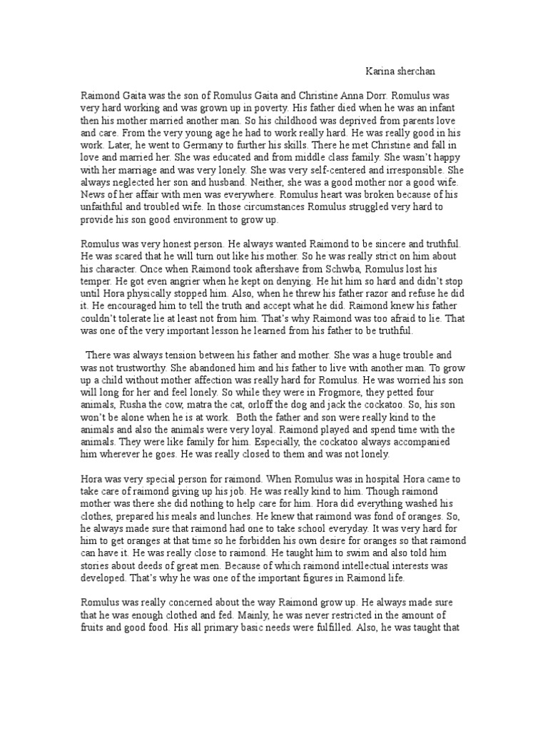 Check out this FREE essay on Romulus My Father ️ and use it to write your own unique paper. New York Essays - database with more than college essays for A+ grades · Essay- Community and Society Belonging is a paradoxical concept illustrating an individual’s sense of inclusions and exclusion simultaneously. This is evident in Raimond Gaita’s memoir Romulus My father as the individuals Romulus, Raimond and Christine experience the dynamic changes evident in the concept of belong to place, society and community Since Gaita is recalling events from when he was quite young, Romulus, My Father is an episodic memoir with gaps and some information missing. It was also written after Romulus’s death, so some parts of his life story are incomplete. Romulus Gaita is born in in the Romanian-speaking part of Yugoslavia